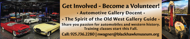 The Museum's new docent training program for the automotive docent program, and the Gallery Guide training program for our Spirit of the Old West Gallery will be starting in late Fall. We are looking for people interested in joining the next training program. If you are interested in becoming involved with the Museums' docent and gallery guide program, please contact Nora Wager at 925.736.2280 ext 238 or email docent@BlackhawkMuseum.org for information.