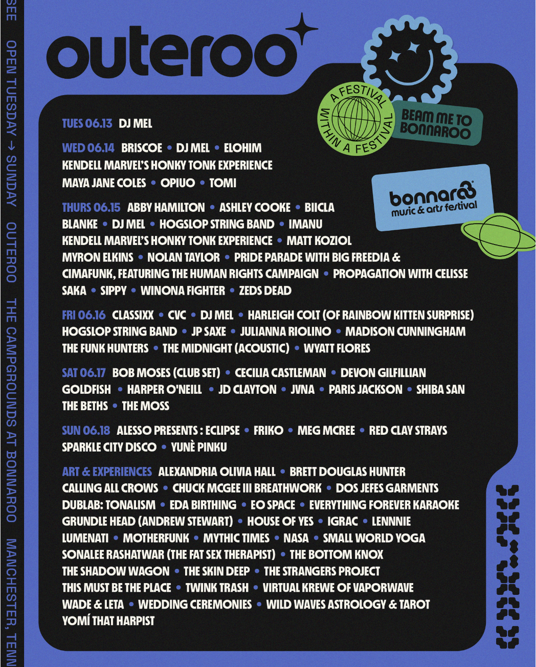 Camping at Bonnaroo is hardly “camping” by most definitions of the word – it’s an endless adventure of discovery and human connection as well as a key part of the one-of-a-kind Bonnaroo experience. Strategically located and well-lit public places throughout the campgrounds, Bonnaroo’s communal areas, known as Plazas, include shade, free public Wi-Fi, showers, activities, charging stations, misting stations, medical, safety stations, information and portable restrooms. 2023’s out-of-this-world Campground Plazas lineup features a number of returning favorites along with several all-new experiences and over 80 additional artists not featured on the main festival bill. Headline acts include Alesso (Eclipse), Bob Moses, Zeds Dead, Madison Cunnigham, JP Saxe, Big Freedia, Maya Jane Coles, Ashley Cooke, Hogslop String band, Shiba San. For details, updates, and much more, please visit https://www.bonnaroo.com/campground-plazas.