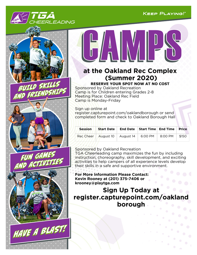 Oakland Recreation is hosting TGA Cheerleading Camps this summer. Registration is open until August 1, 2020.