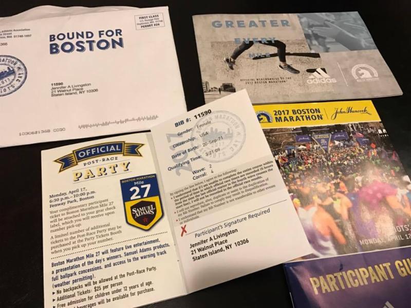 My (Jennifer Livingston) 2017 Boston Marathon acceptance letter, running bib 11590. Says Richard, 'the coincidence is uncanny as I receive thousands of dollars in toy donations from Babies R Us (zip code 11590) and I picked up toys two days ago, the toys are donated in conjunction with K.I.D.S/Fashion Delivers