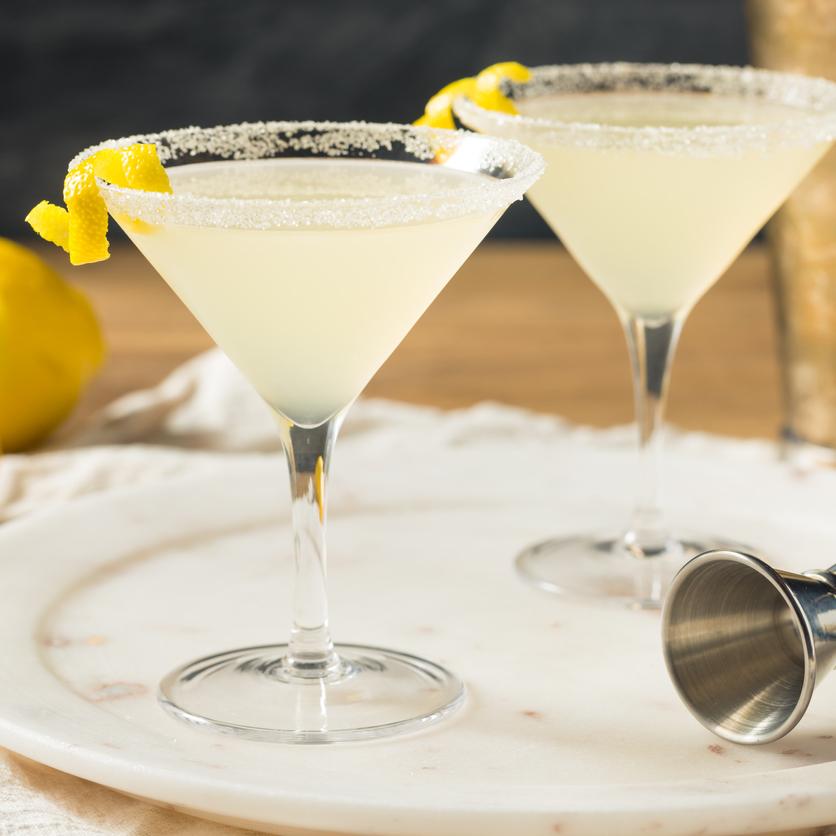 Made of vodka, limoncello (a sweet, Italian liqueur), lemon juice, and simple syrup, you coat the rim of the glass with lemon and dust it with granulated sugar. It is served with a twist.