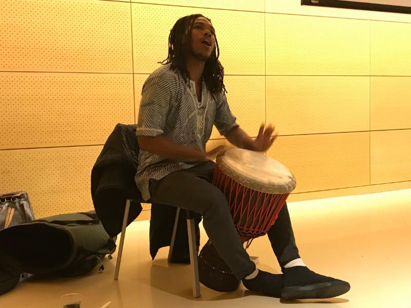 Kweku Sumbry from the New School's School of Jazz opened the program with lively African drumbeats.