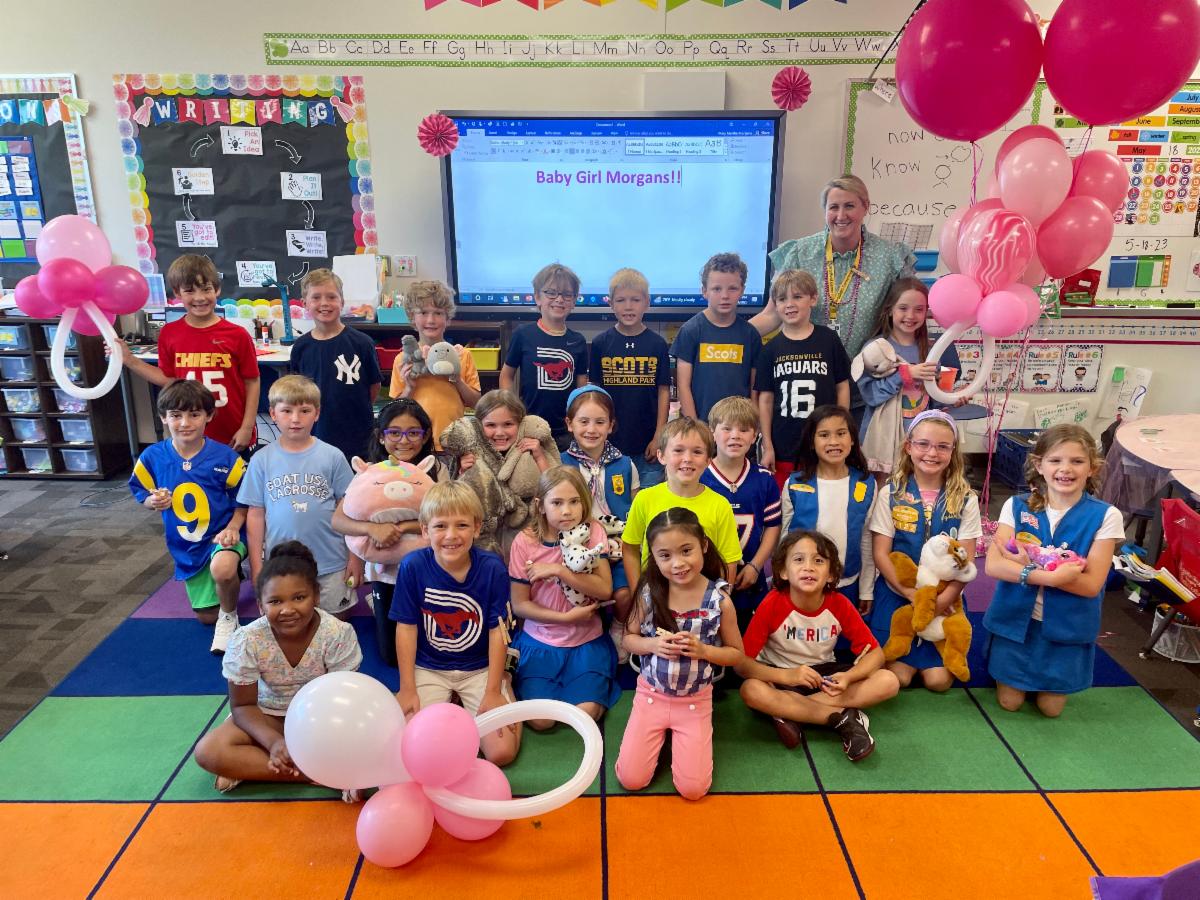 Mary Martha Morgans’ 1st grade class surprised her on Thursday with a “sprinkle” to celebrate her baby girl, due in September. The class enjoyed games and treats, and Ms. Morgans opened lots of pink gifts. The sweetest gift was the book “Dear Girl” signed by the class. | |