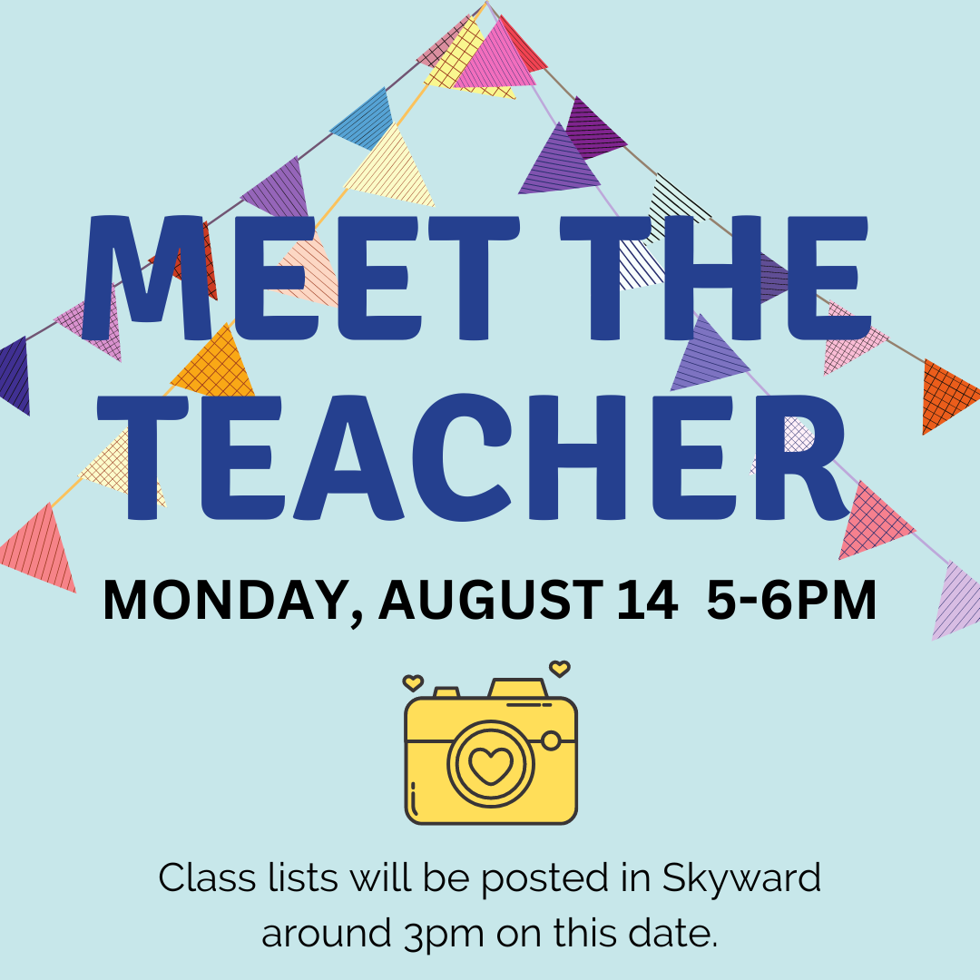 - 8/14: Meet the Teacher 5-6PM, Class list 3PM