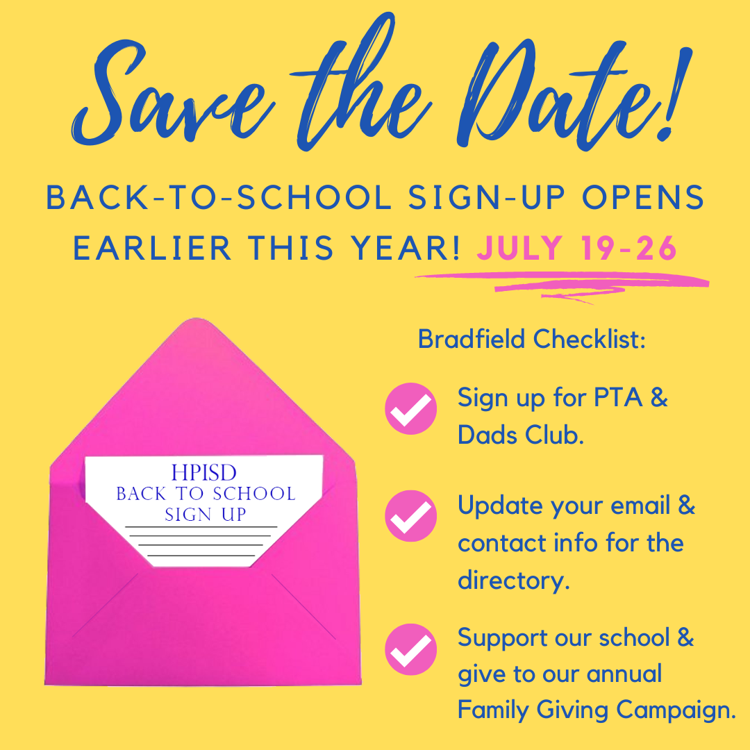 Please share this information with friends who will be new to Bradfield. New families haven't been added to our email system yet. Thanks! | |