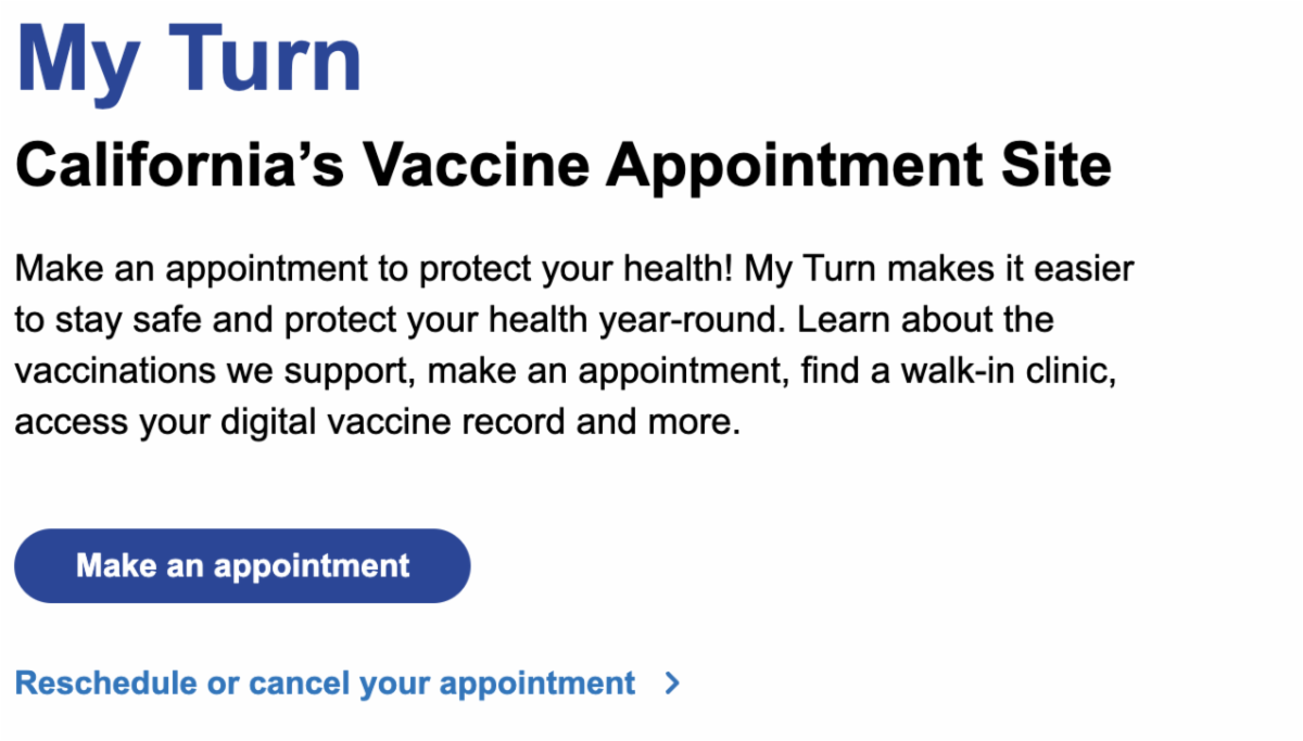 Contact a health care provider or schedule your vaccine appointments on My Turn. You can also find vaccine appointments at vaccines.gov or your local pharmacy.