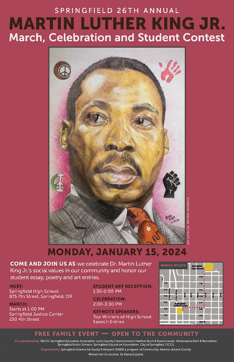 Looking to celebrate on Monday? Join either the NAACP Annual MLK March in Eugene at 9:30 a.m., or the Springfield MLK March for Justice and Equality at 1 p.m.