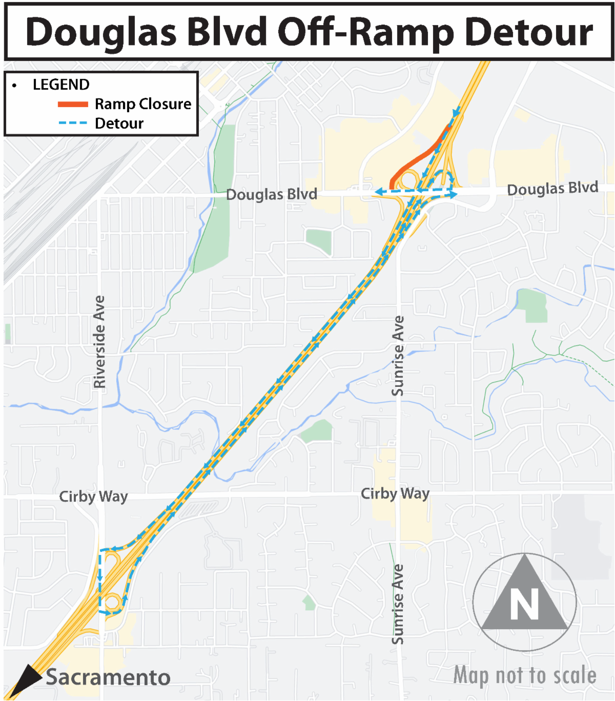The off-ramp is scheduled to be closed from 9 p.m. Friday, August 16 to 5 a.m. Monday, August 19. Motorists looking to exit Douglas Boulevard will detour westbound on I-80 to the Riverside Avenue exit. At the stoplight, make a left and then take another left onto the I-80 eastbound on-ramp, where they will be able to head back to the Douglas Boulevard exit.