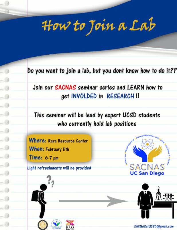 SACNAS is offering a seminar called "How to Join a Lab." This is an excellent opportunity for students to get advice from expert UCSD students who currently hold lab positions.