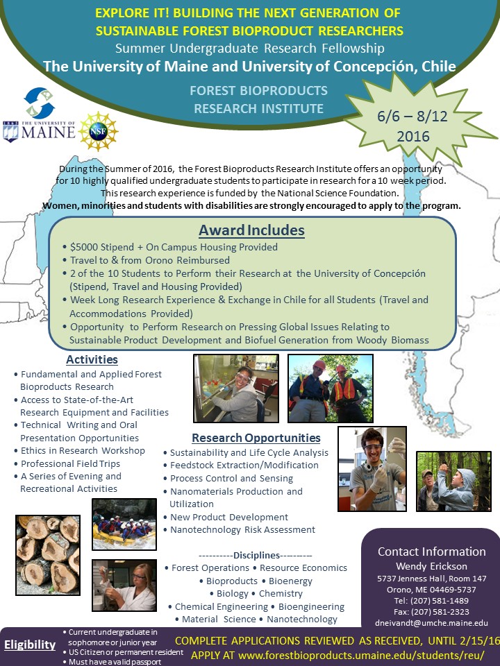 During the Summer of 2016, the Forest Bioproducts Research Institute offers for the third year student an opportunity for highly qualified undergraduate students to participate in research for a 10 week period, 06/06 - 08/12/2016 .