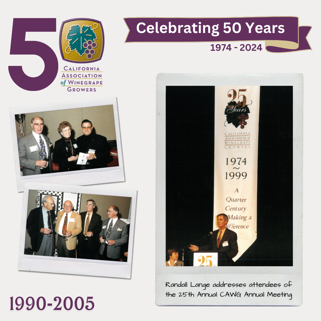 Countdown to #CAWG50 - As CAWG celebrates its 50-year milestone, it reflects on the halfway point in 1999, a significant year in the association’s history. CAWG commemorated 25 years of advocacy and leadership while celebrating legislative successes that shaped the future of viticulture in California.