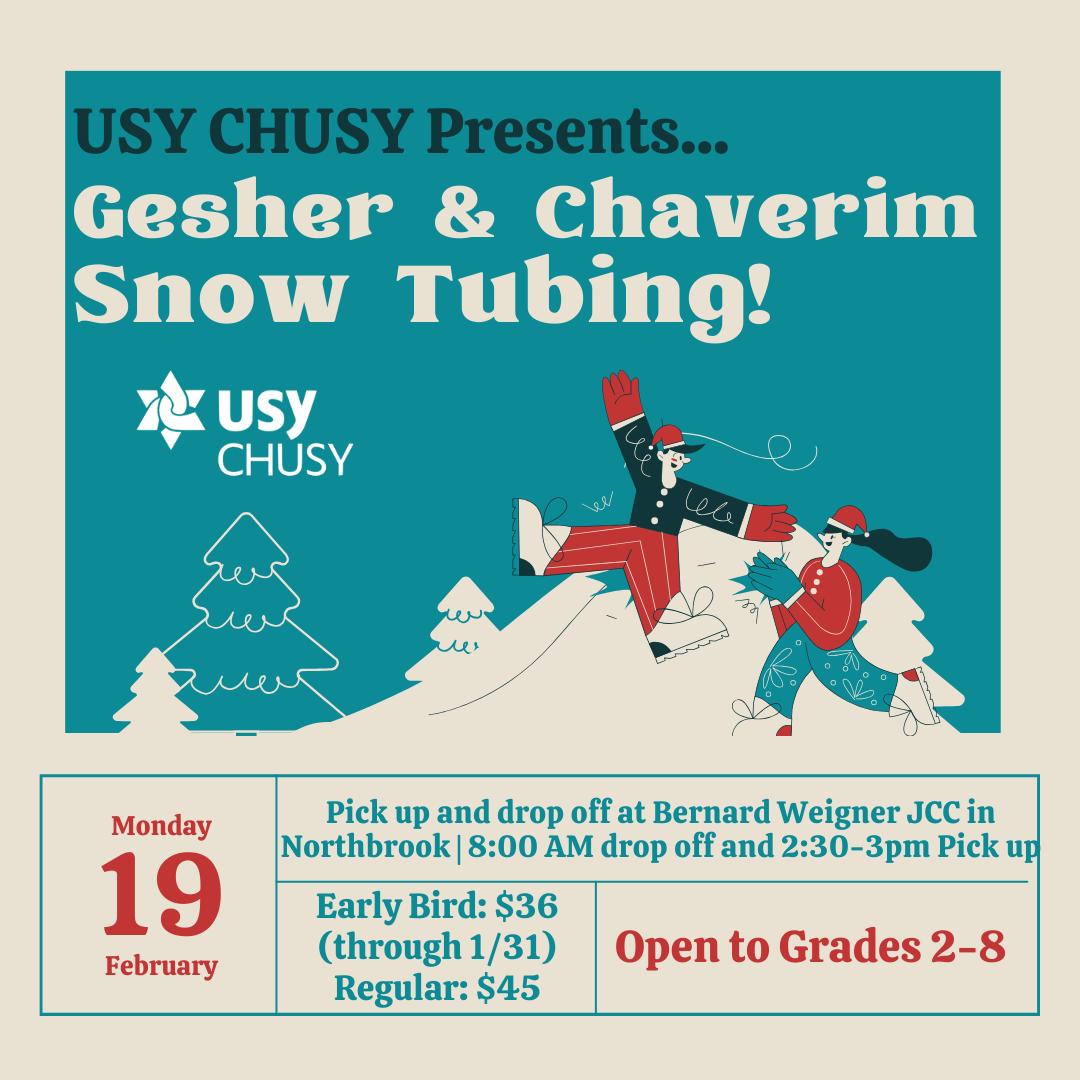 Registration for CHUSY Snow Tubing is open! All Jewish 2nd-8th graders are welcome to join us on Presidents' Day, February 19th, for a fun day of snow tubing at Villa Olivia in the morning. The afternoon will be packed full of fun games and social action projects at the Revere in the Bernard Weinger JCC, including arcade games, blanket making, skeeball, shuffle board, foosball, and more!