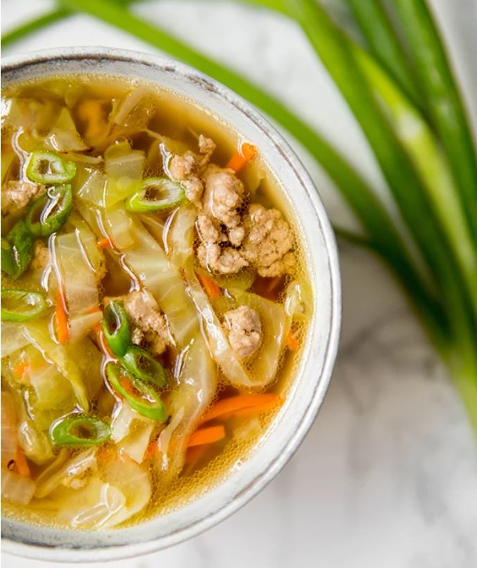 - Pour in the broth, cabbage, cooked pork, coconut aminos, garlic powder, and grated ginger and mix well to combine.