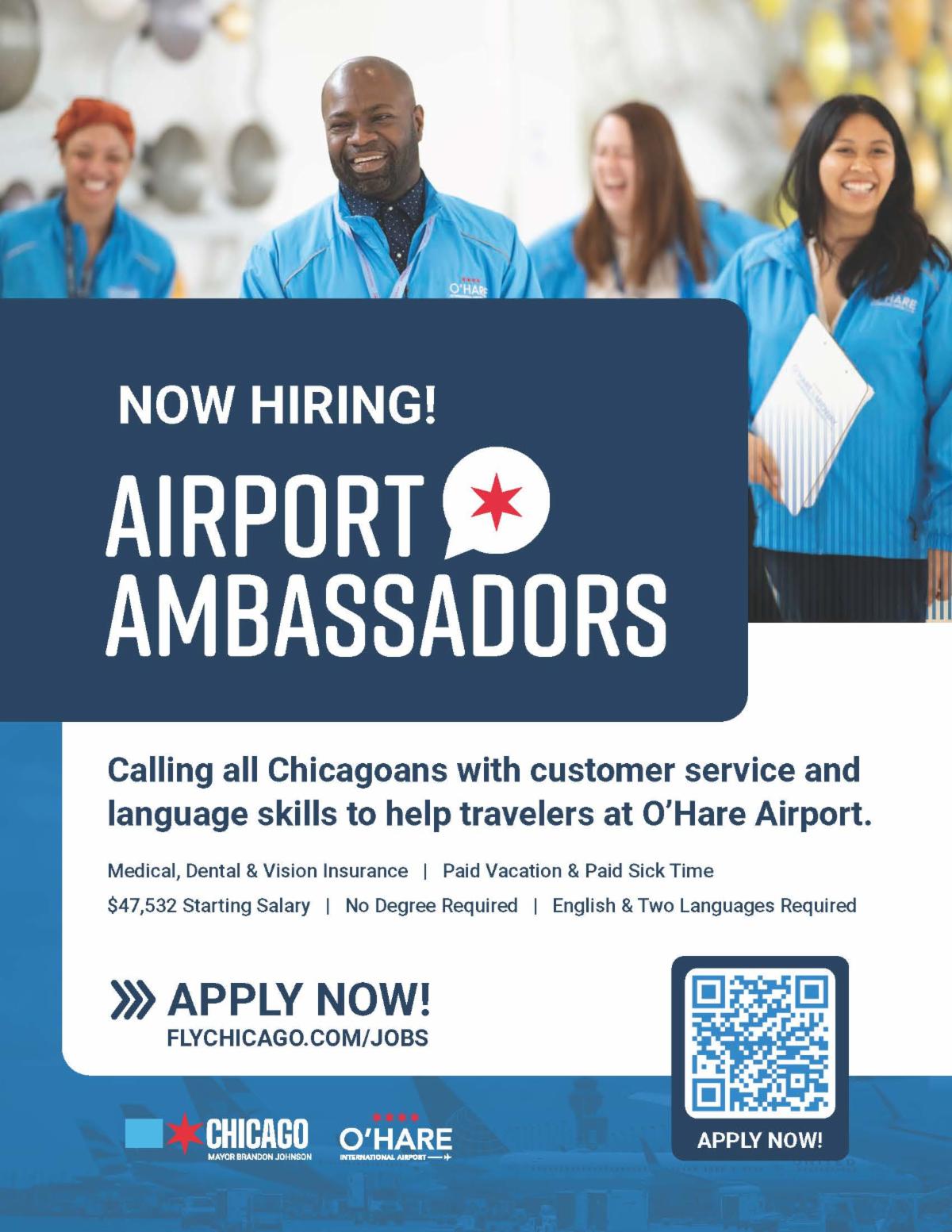 The posting, available at Chicago.gov/careers, seeks candidates with one year of customer service experience who have conversational proficiency in three languages, including English. The position, which is union represented and based at O’Hare, does not require a high school or college degree. The starting salary is $47,532 and includes a full suite of City of Chicago benefits, including medical, dental and vision insurance, paid vacation and sick time, and a City pension plan