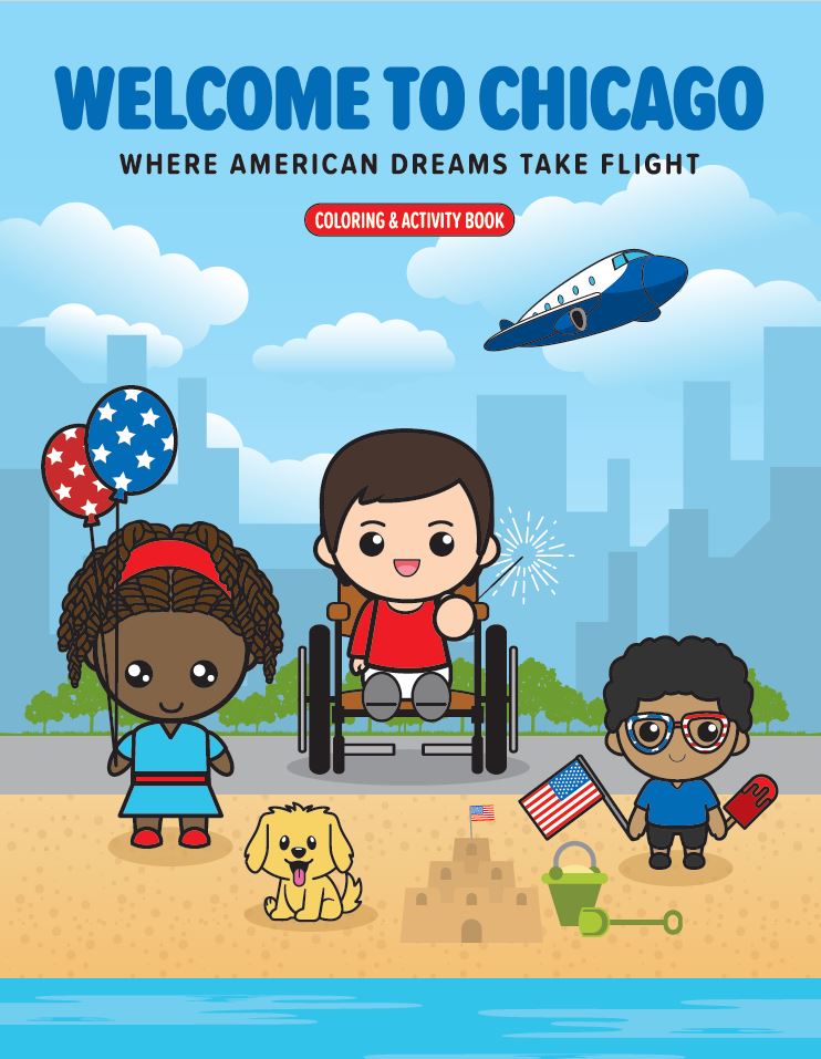 The Welcome to Chicago activity book highlights the patriotism of Chicago as a hard-working city built by a melting pot of diverse cultures from all over the world.