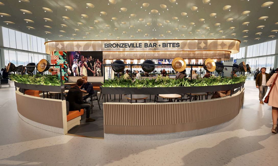 Bronzeville Bites will feature a signature bar with small plates modeled after Bronzeville Winery in the namesake neighborhood. The 10-year lease agreement allows San Francisco-based High Flying Foods to operate the restaurant with local partners Hyde Park Hospitality LLC and Santa Klorina LLC in a joint venture achieving an ACDBE participation rate of 55%.