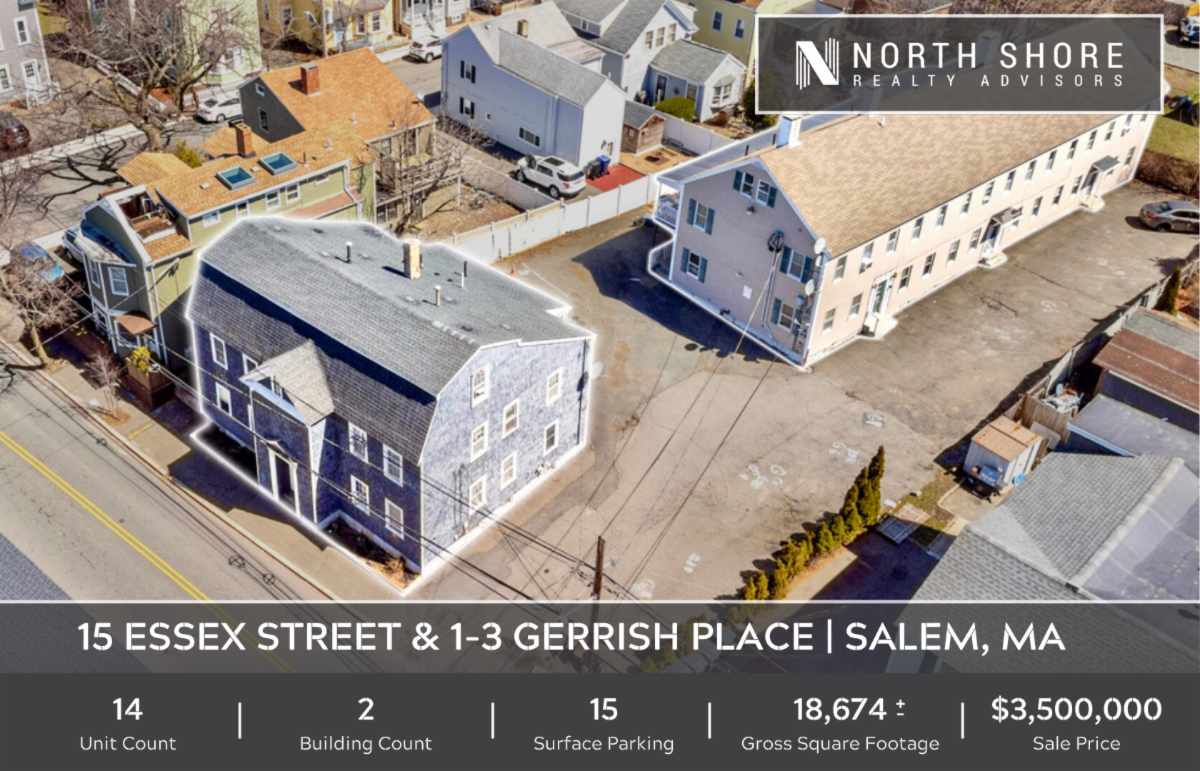 North Shore Realty Advisors Inc. is pleased to announce the recent sale of 15 Essex and 1-3 Gerrish Place located within the Salem Commons District of Salem, MA. The offering consisted of one (1) four-unit building (15 Essex) and one (1) ten-unit building (1-3 Gerrish Place). The property consists of six (6) two-bedroom units, and eight (8) one-bedroom units, with 15 surface parking and laundry facilities. The portfolio is situated on a leveled paved lot of .33 acres (15,072 SF) with a total gross square footage of 18,674 ± and rentable square footage of 10,998 ±.