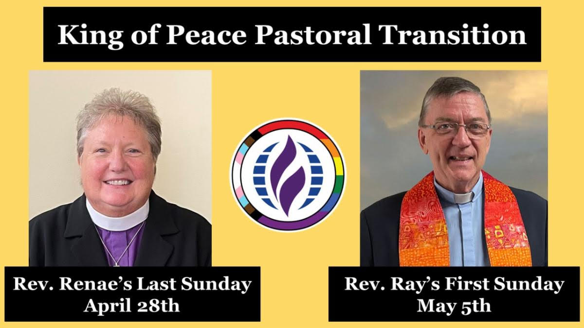 Rev. Ray's first Sunday as Senior Pastor will be May 5th. During that service, Rev. Ray will preach and Rev. Renae will be present to participate in 'passing the mantle'. Please join them in person or you can also check out the worship service via Facebook Live https://www.facebook.com/KingofPeaceMCC/