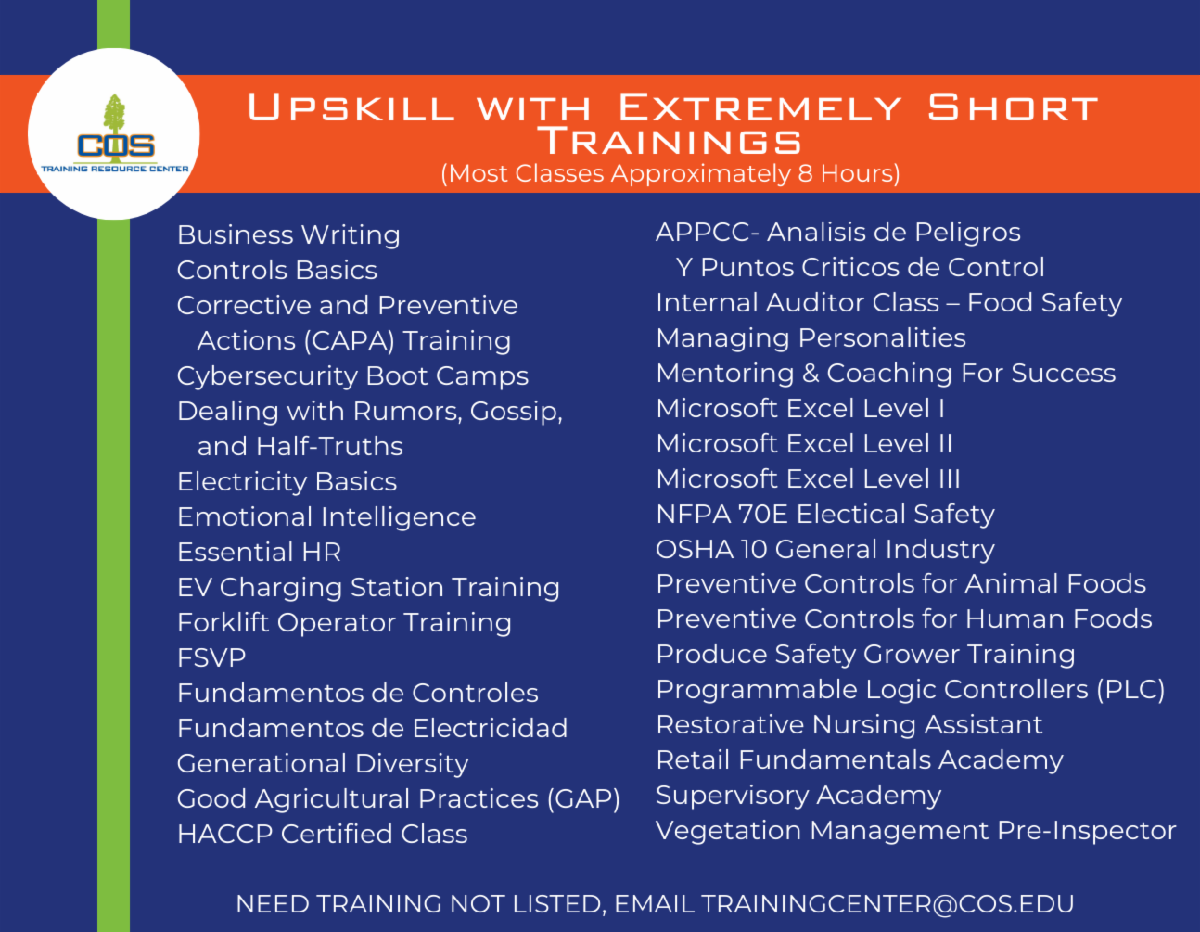 In partnership with the College of the Sequoias (COS) Training Resource Center, the Visalia Economic Development Corporation (VEDC) is offering companies, organizations, and individuals the opportunity to take trainings or classes with the COS Training Resource Center via a full or partial scholarship. This is a fantastic opportunity for those looking to upskill themselves in their careers and industry without having to be concerned with the costs of training.