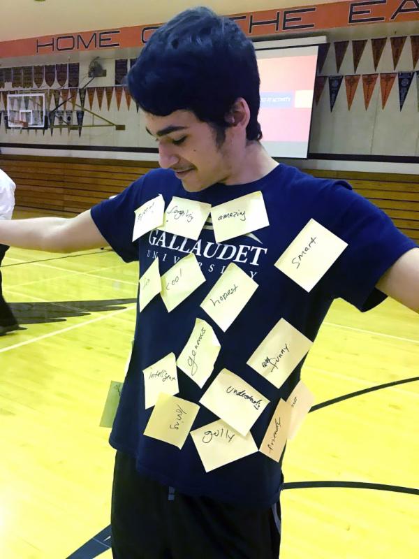 Student wearing Gallaudet T-shirt that is covered with yellow post-its, standing in gym.