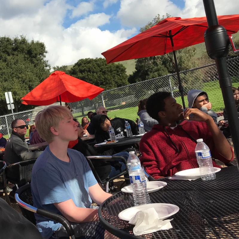 Patio tables filled with high school students intently watching the presentation.