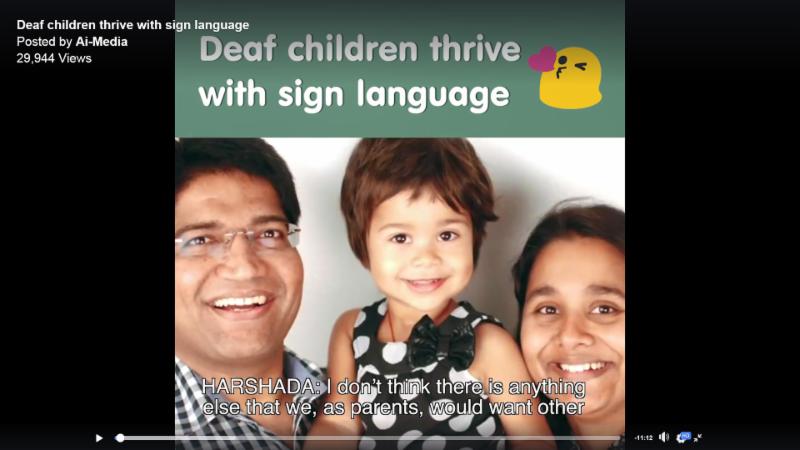 Green banner with text, "Deaf children thrive with sign language" and emoji blowing a kiss.
