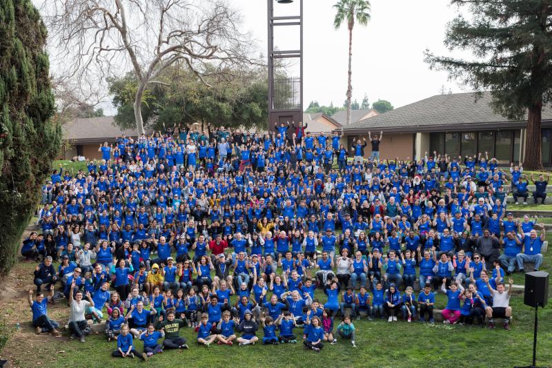 Group photo of hundreds of volunteers, wearing blue Apple T-shirts, signing "Eagle" with both hands up in the air in the shape of the talons. Volunteers are sitting in rows that gradually ascend, with the bottom row of kids sitting on the grass and the top row standing next to the Bell Tower.
