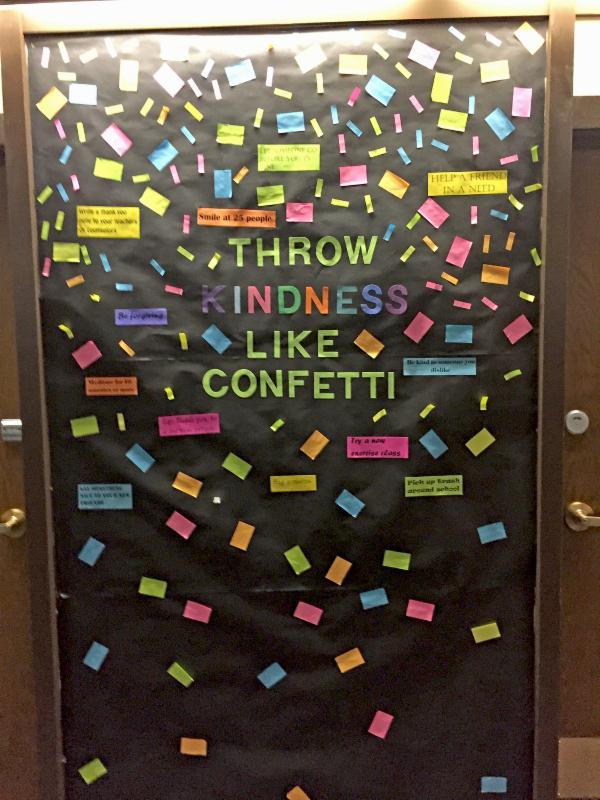 Ms. Nelly Hencker and her Life Skills students created this "Throw Kindness Like Confetti" themed bulletin board in the high school building (and on the lockers).