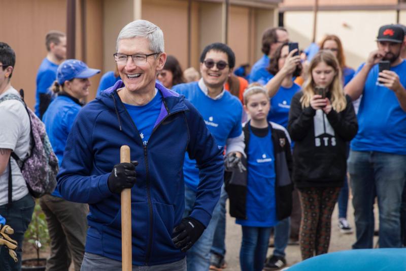 Tim Cook has one hand holding a shovel and the other hand on his hip. He has a big smile on his face. The crowd behind him is taking photos. Everyone is wearing blue T-shirts.