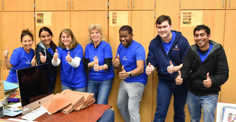 A group of volunteers line up in their blue T-shirts all signing "two thumbs up". Wooden cabinets line the wall behind them. A table with a computer and books is in front of them.