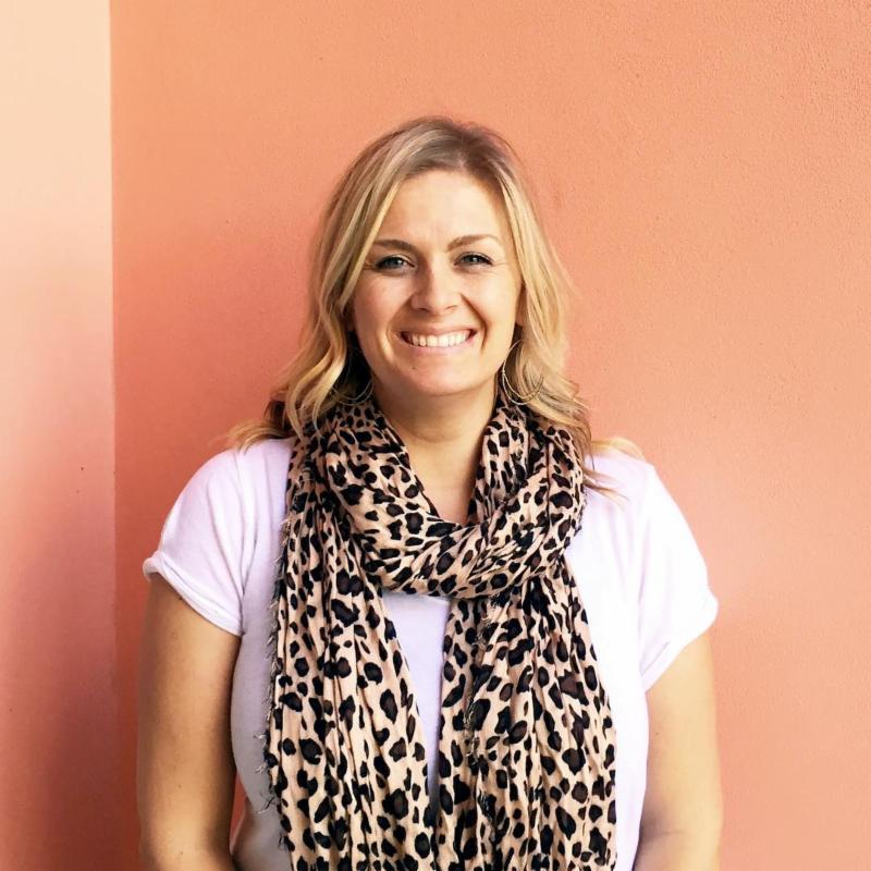 Head shot of Karina Pedersen with a big smile. She's wearing a white woman's T-shirt with a leopard-print stole. The wall behind her is orange.