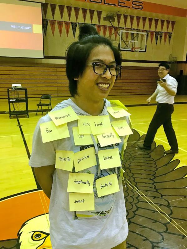 “Post-It Notes” where five groups (Class of 2018; Class of 2019; Class of 2020; Class of 2021 and Staff) had to compete by sharing positive words on post-it notes, then adding them to an assigned person within two minutes.