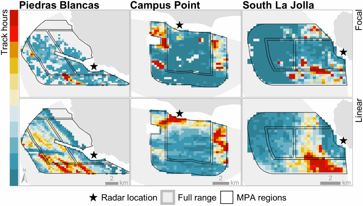 Figure: Total M2 track hours across the study areas. Blue to red shading indicates low to high values, respectively | |