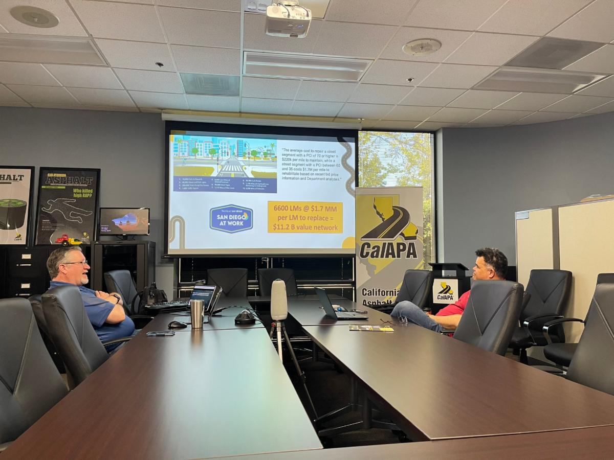 CalAPA Director of Technical Services Brandon Milar, P.E., (right) and Scott Dmytrow with PavementACES consulting fine-tune Dmytrow's presentations at CalAPA offices prior to deliver at the NACE Conference. | |