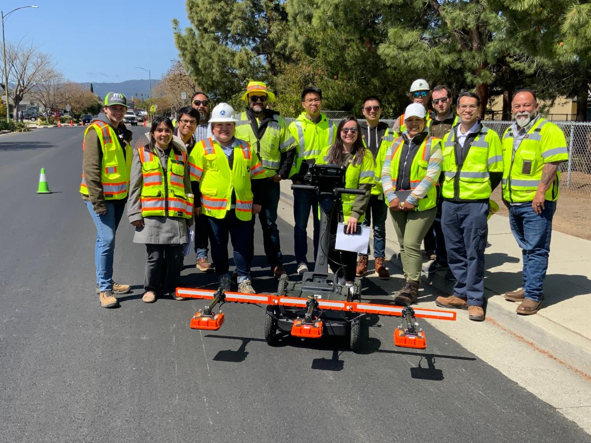 Attendees at a Women of Asphalt California Branch-organized field demonstration of DPS technology April 20, 2023 in San Jose. Pictured, left to right: Frank Farshidi with the City of San Jose DOT; John Lamond with TransTech Systems, Inc.,; Sarah Sisson with InstroTek; Wesley Gee, Open to Work; Joseph Phan with MCK Services, Inc.,; Farzan Kazemi with Atlas; David LeTorik with BSK Associates; Cesar Estrada with the City and County of San Francisco; Monica Jurado with FHWA Resource Center; and Mercedes Kuznia with Minnesota DOT.
