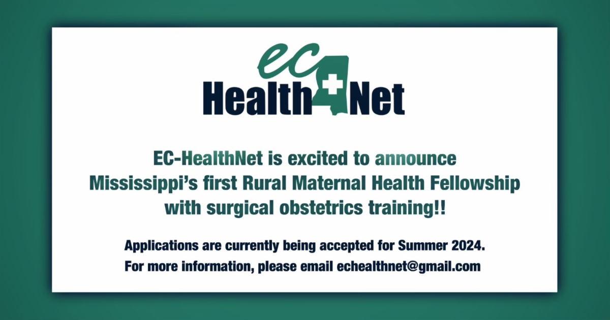 Applications are currently being accepted for Mississippi's first Rural Maternal Health Fellowship for the summer of 2024. For more information, please email echealthnet@gmail.com.