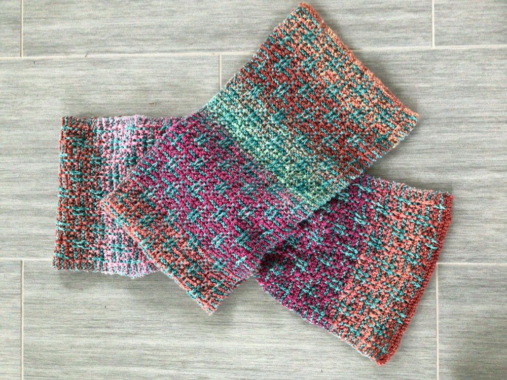 Mary Alice knitted this mosaic scarf from the two yarns, Sonata and Sonata Shima. The pattern was written for a cowl, but she decided she would like a scarf better. You can find the pattern on Ravelry, Mosaic Cowl by Hannah Wallace.