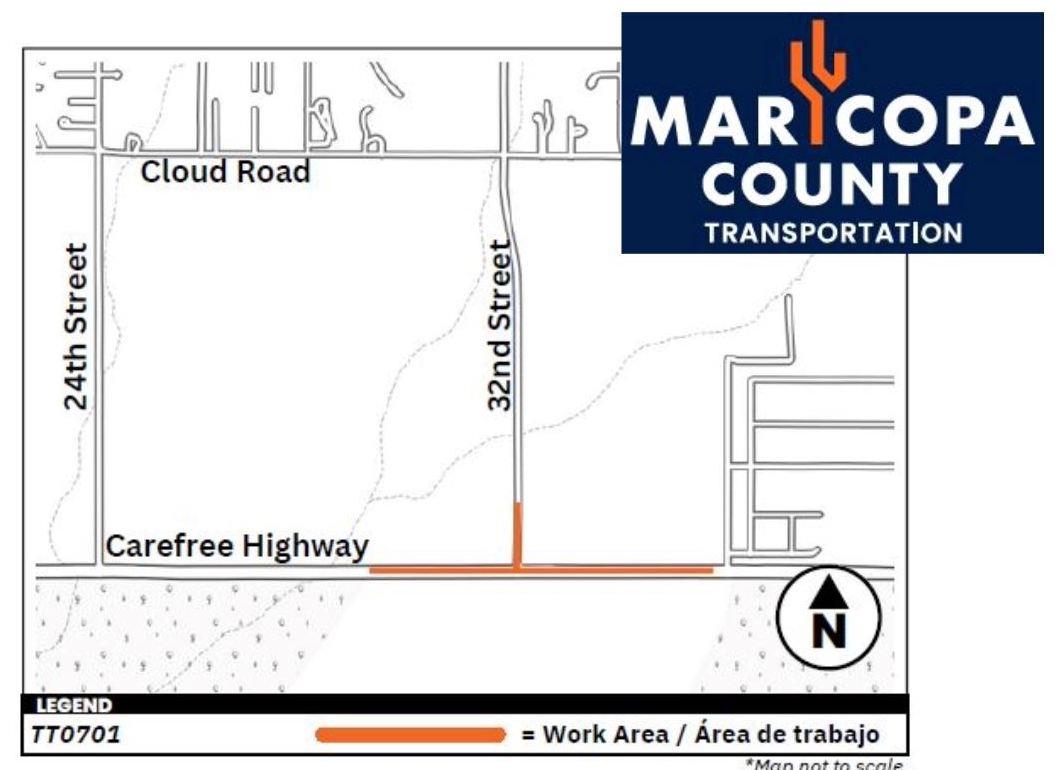 Maricopa County Transportation will be working on intersection improvements at the intersection of Carefree Hwy & 32nd Street - Monday, May 13th through the end of June from 6:00 am to 3:00 pm Mondays-Fridays.