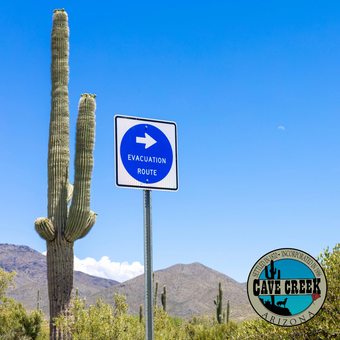 For this reason, evacuation route signs are starting to be installed by our Cave Creek Field Operations folks. The ones in the area near Spur Cross and Fleming Springs are to assist our residents in the Northern or NE parts of town with finding an alternate evacuation route for themselves and maybe their horse trailers in the event of a larger wildland/interface fire. Specifically, these should help to direct them to the newly improved Arroyo Road alternate route. Eventually, there will be approximately 30 new evacuation route signs installed.