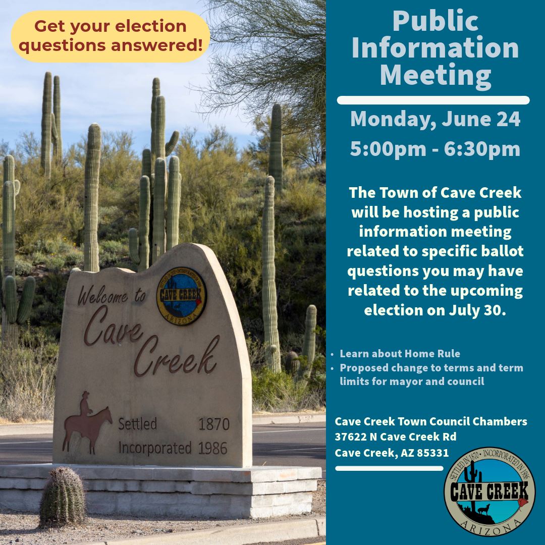 The Town of Cave Creek is hosting a public information meeting in the Cave Creek Town Council Chambers regarding specific ballot questions and concerns related to the July 30 election.