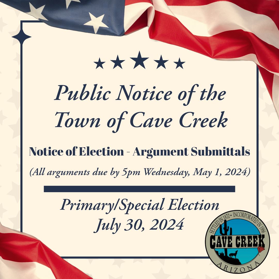The Town of Cave Creek will hold an election on July 30, 2024, for the purpose of electing a Mayor and 6 Council Members to serve on the Cave Creek Town Council, for consideration of renewal of a Local Alternative Expenditure Limitation - Home Rule Option (first approved by voters in May 1999 and renewed in May 2003, May 2007, May 2011, August 2016 and August 2020.) Additionally, voters will have an opportunity to consider changing the current 2 year terms for Mayor and Council to a 4 year term for Mayor and 4 year staggered terms for Council.