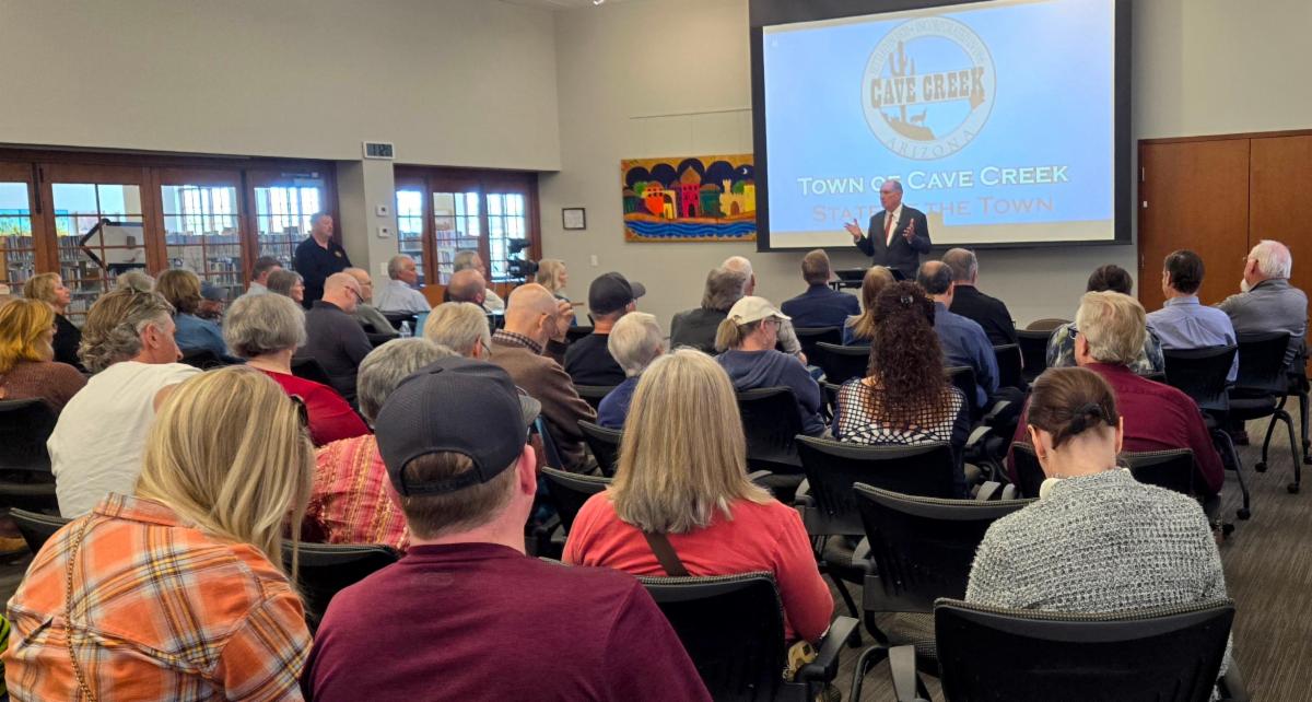 On Feb 28, Cave Creek’s Mayor Bob Morris addressed a room full of invited neighbors and friends at the Desert Foothills Library for his first annual “State of the Town” presentation. The event celebrated Cave Creek’s 2023 accomplishments. Those at the event also had the opportunity to meet Cave Creek's new town manager, Grady E. Miller. In addition, present at the event were also Deputy Town Manager Teresa Riza, Vice-Mayor Royer, Council Members Eelkema and McGuire, Marshal Stein, Town Directors, and Carefree’s Mayor Crane.