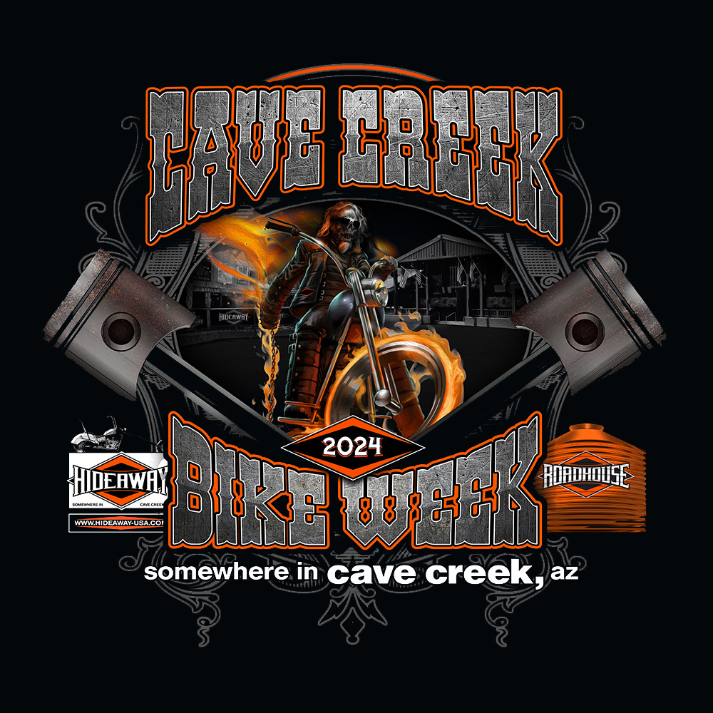 The Hideaway Grill / Roadhouse is hosting the 26th annual Cave Creek Bike Week from the 29th of March until the 7th of April in 2024! This is the Silver Anniversary and going to be the biggest Bike Week yet. Contests, stunts, gypsy rides, tons of vendors, live music, builders, open house, and more! Info HERE.