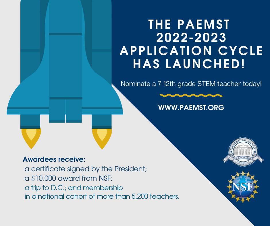 Nominations for the 2022-23 Presidential Awards for Excellence in Mathematics and Science Teaching, or PAEMST, are OPEN!