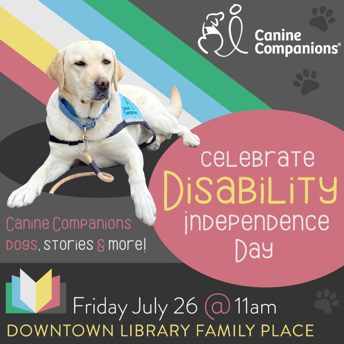 On July 26, 1990, the Americans with Disabilities Act was signed into law. We are celebrating Disability Independence Day on Friday, July 26 at 11am with a visit from Canine Companions dogs, stories and more!