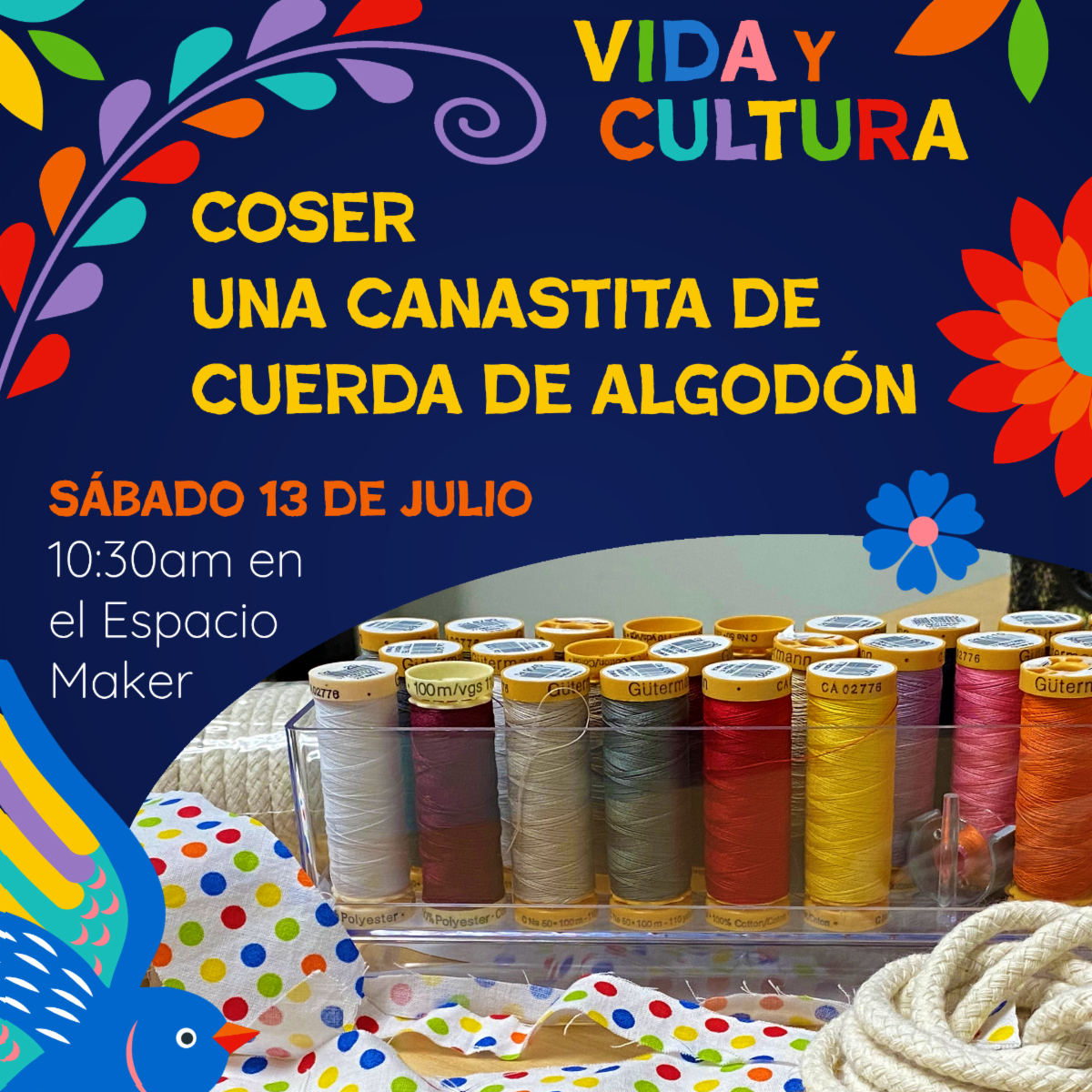 Acompáñenos en este taller práctico donde usaremos una máquina de coser para hacer una canastita decorativa de cuerda de algodón. El espacio es limitado.