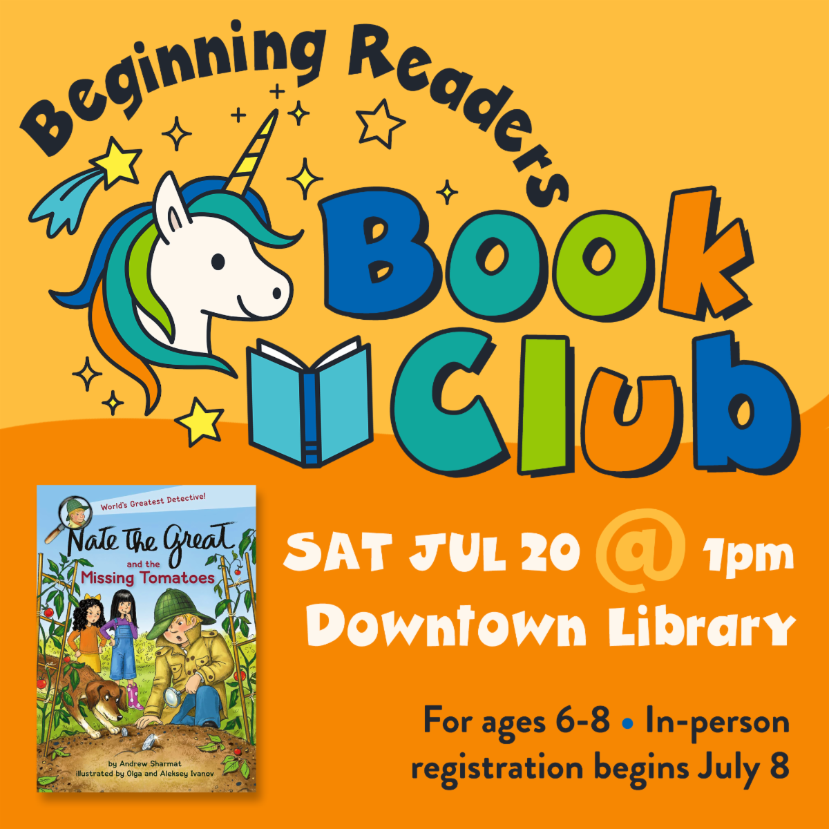 Join us for the Beginning Readers Book Club! You can pick up a copy of Nate the Great and the Missing Tomatoes at the Children's desk at the Downtown Library starting Monday July 8.