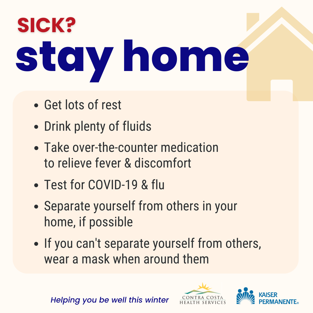 This winter, many viruses (COVID, influenza and RSV) are spreading in the community, creating crowded waiting rooms at doctors’ offices and hospital emergency rooms. Fortunately, most people who get sick with a virus can recover safely at home. We’re sharing some helpful tips from Contra Costa Health and Kaiser Permanente about what to do if you or your family get sick.