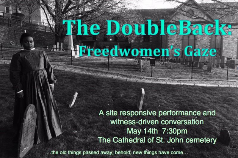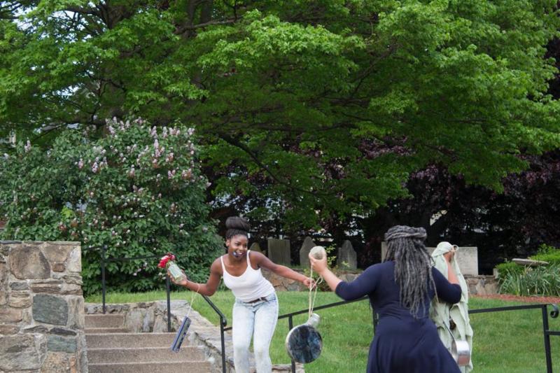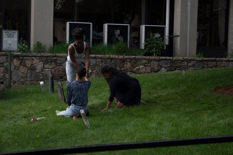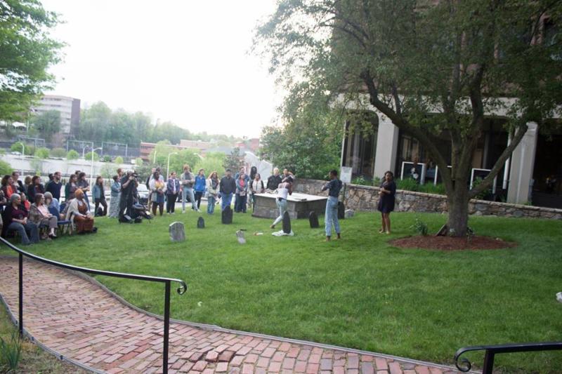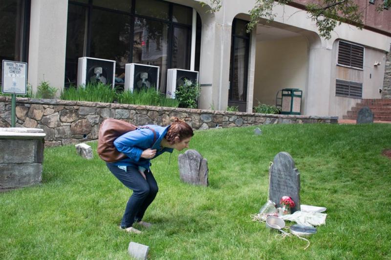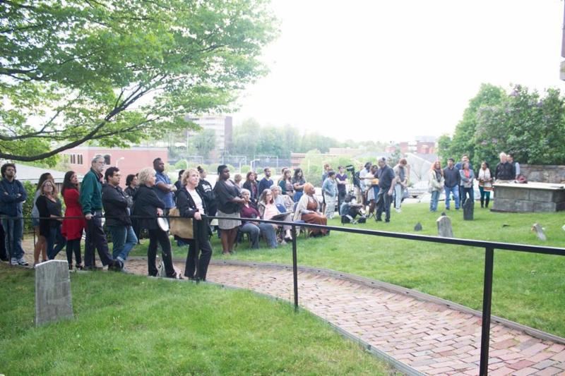 On Saturday, May 14 the Center for Reconciliation hosted a "site responsive performance and witness-driven conversation" in the Cathedral of St. John's 18th century cemetery. As the sun set, three young black women playfully led a procession of more than 50 participants into the graveyard. The women danced among the stones, swayed, hummed and cried out. Their provocative performance centered around the single footstone of Phillis, Rose and Fanny Chace, three black women who had been enslaved to Samuel Chace Esq. in the late 1700's. While the women died at different times, they were buried at the farthest edge of the cemetery and given a single stone. Their former master is buried on the opposite end of the hill nestled in a corner of the Cathedral. That Saturday, the thousands of words written about the life and legacy of Samuel Chace were put aside in order to honor the sparse notes on his three "faithful servants."