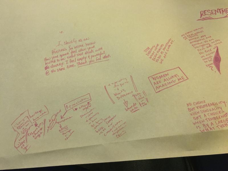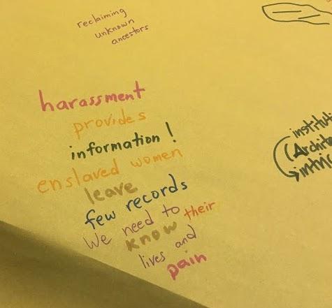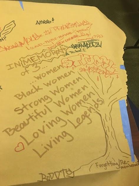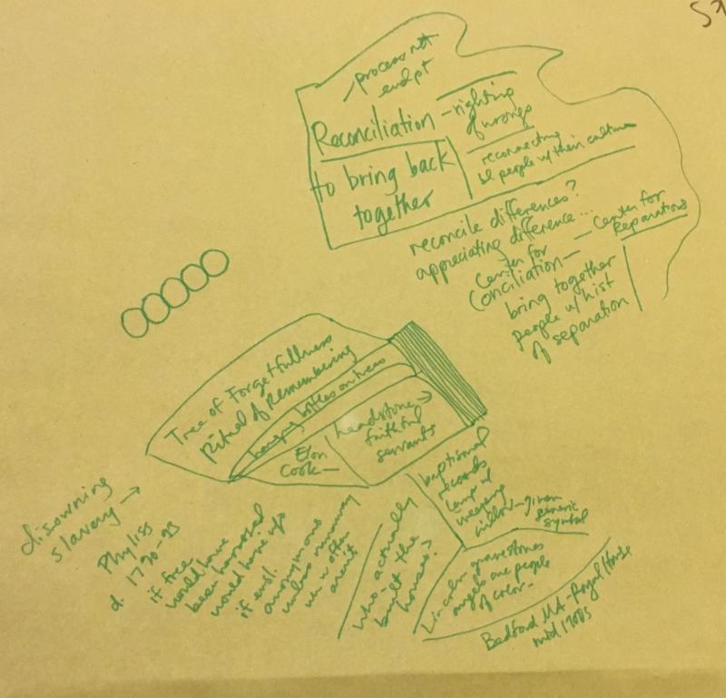 Inside the Episcopal Diocese participants were given markers and offered a chance to scrawl notes, drawings or even sketch out new epitaphs for Phillis, Rose and Fanny on large swaths of butcher paper. During the audience conversation with historian Joanne Melish, artist Arielle Brown and the Center for Reconciliation's program manager and curator, Elon Cook, the audience learned of the many barriers in the way of researching enslaved Africans in Rhode Island, and the tragedies and triumphs of the local black community.